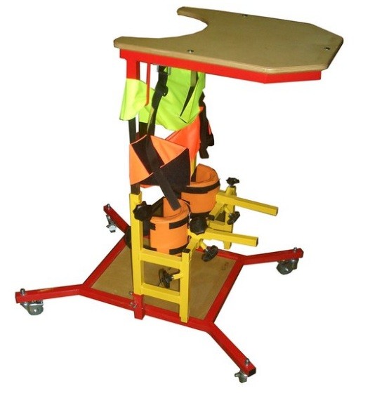 Вертикализатор снабжен мягкими коленоупорами, грудным и тазовым ремнями, креплениями для стоп типа «сандалии» и столиком. Комплектуется съемным столиком для приема пищи и занятий.