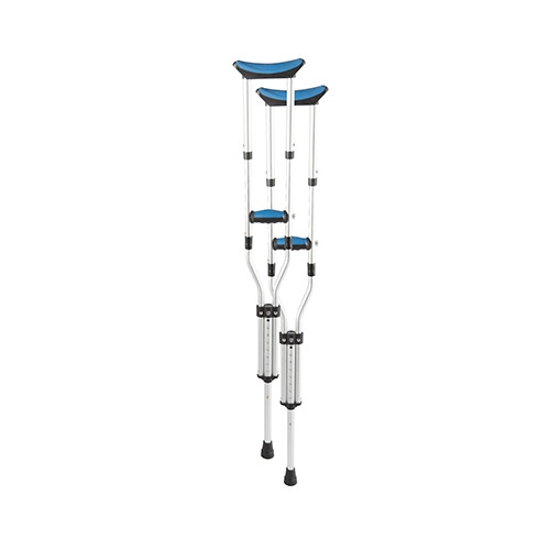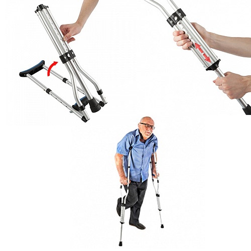 Универсальные подмышечные костыли. Изготовлены из прочного алюминия, имеют удобный анатомический валик для кисти и подмышечной впадины. Складная система позволяет легко разместить костыли в автомобиле, под столом, в ресторане, в самолете, просто потянув за две части. Универсальная система позволяет отрегулировать костыли под индивидуальный рост взрослого человека и подростка. Оснащены резиновыми наконечниками и способны выдержать вес до 115 кг.